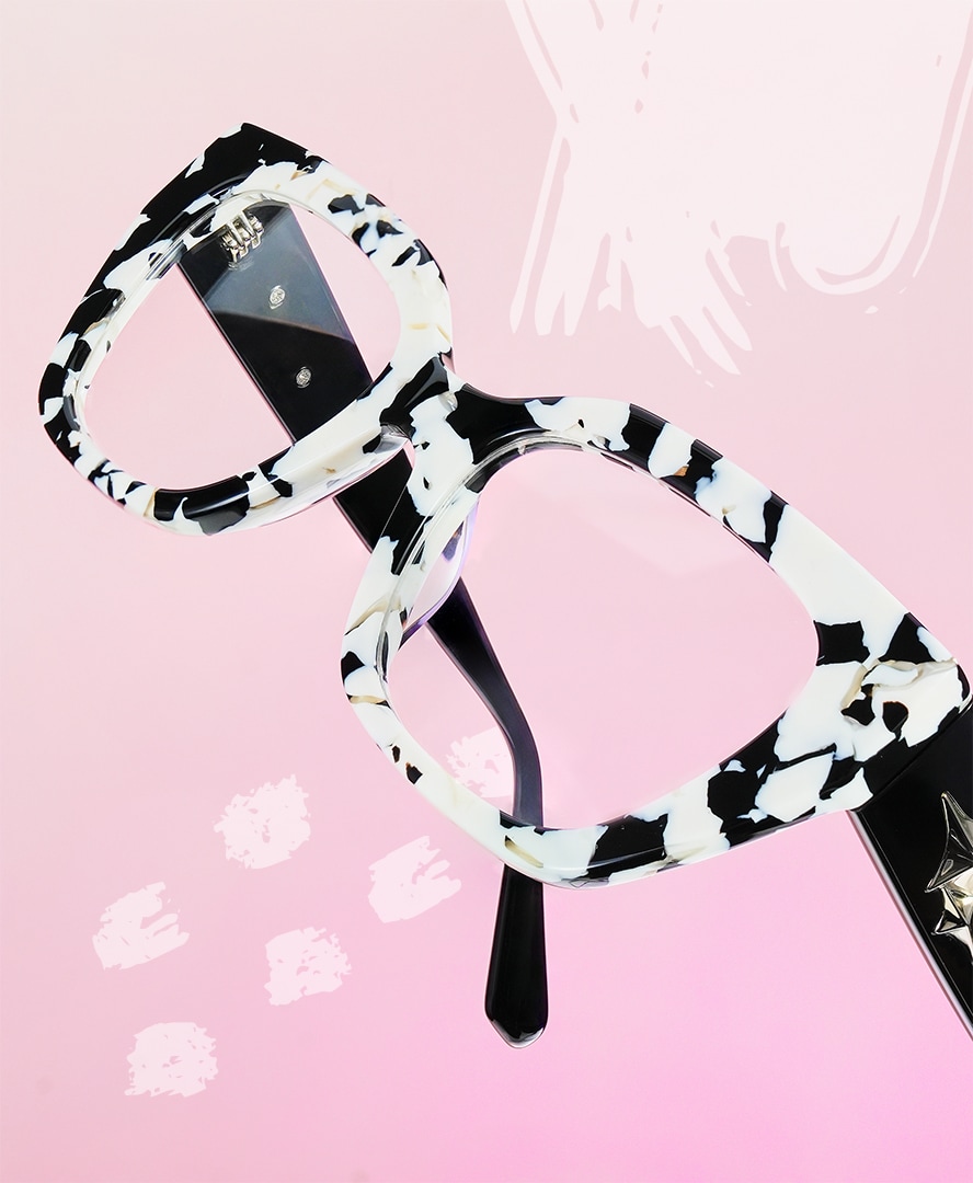 Flare is a pair of rectangular animal print eyeglasses featuring a cow print finish in acetate, which is durable and sturdy. The full-frame eyeglasses are an optimal fit for various face shapes, making them ideal for fashion-forward social occasions for women.